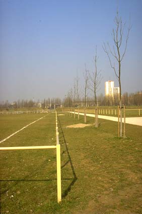 deux terrains de football (comme si les dix que lon peut compter dans un rayon de deux kilomètres ne suffisaient pas), des allées en béton de deux mètres cinquante de large (à la mesure de la voiture!), des alignements darbres identiques, découpant en lignes droites des étendues de " moquette verte " boueuse.