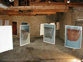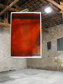 Les drapeaux de prières se déroulent, le spectateur entre dans un lieu de recueillement. Dans le prolongement de sa quête personnelle et spirituelle, Stephan Barron guide le spectateur vers un chemin initiatique ; celui-ci se laisse tenter par cette invitation à l'abandon, se plongeant dans l'immense vide spirituel et constant. Les pages d'infini s'ouvrent et se referment, parfois face ou dos au spectateur. Celui-ci se déplace librement dans cet espace de création. L'espace photographique devient une étendue des possibles,illimitée, dans une pauvreté formelle, plastique et architecturale. Ce décor minimal, noyé dans l'étendue du vide, stimule et inspire : le spectateur circule et rencontre des aplats de couleurs sombres et profondes, trace d'une présence calme et sublime. Les drapeaux, en suspension dans l'atmosphère, séparent, encerclent, coupent l'espace et le décompose en quatre lieux de quiétude. Endroit mythique. Dans ce paysage de l'isolement, l'esprit se vide de nos pulsions et vibre sur le rythme paisible de la courbe dessinée par ces voiles. Ainsi lartiste nous convie à caresser des yeux la sagesse, dans la passivité et l'écoute du corps intériorisé, dans un juste milieu entre engagement et retrait. Le regard s'élève. L'artiste poursuit sa rencontre avec le ciel. L'image laisse deviner un passage qui mène vers un au-delà mystérieux. La verticalité du trait permet de dépasser l'horizontalité terrestre. Le visiteur quitte l'émotivité qui le fragilise pour accéder à une force inconnue. Instant de religiosité et vécu conscient de notre "être-là " dans le monde. Dans un entrepôt sobre, vide et froid,la toiture joue de transparence pour laisser entrer des fragments de ciel. Au cur du désir, dans ce qui reste d'impalpable et d'inaccessible, la matière s'immobilise. Chute inéluctable dans la mort et dans l'oubli : le tissu presque humain s'abandonne au chaos et à l'inertie. Le voile souple danse entre deux silences. Corps latent qui s'écartèle entre conscience et inconscience, éveil ou anoblissement, rupture ou fuite dans le non concret. Il bascule de l'autre côté, comme attiré vers l'immanence. |