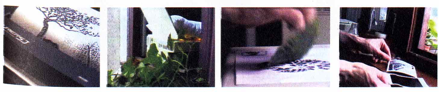 Los diferentes procesos de trabajo de Stéphan Barron son: enviar por fax la fotocopia de una fotografía Polaroid en blanco y negro, enviar la fotocopia de una imagen escaneada en tricomía RGB o enviar directamente el fax de una fotocopia o de una imagen obtenida por tampón.