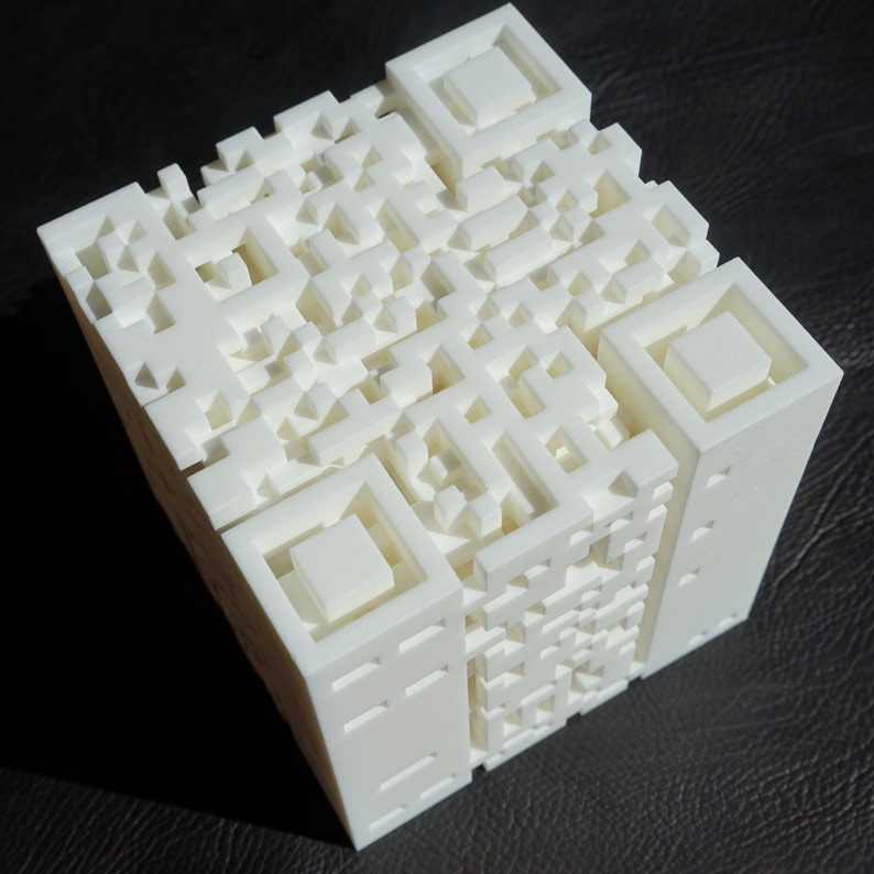 This cubic labyrinth is formed by stacking 25 QR codes tracing the path of Leopold Bloom, hero of James Joyce's Ulysses through the streets of Dublin.